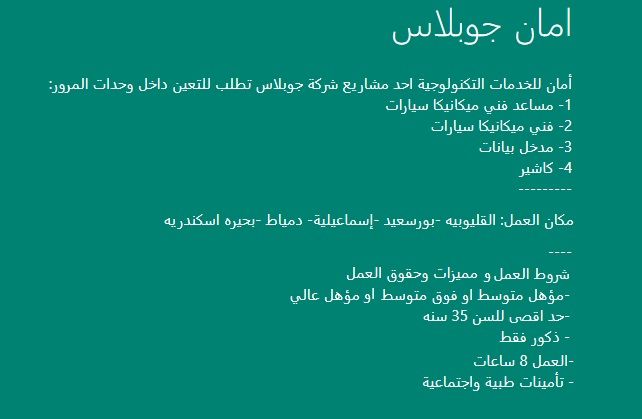 شركة أمان جوبلاس للخدمات التكنولوجية احدي مشاريع شركة جوبلاس العاملة في مجال الخدمات اللوجستية وحلول المرور، عن فرص عمل شاغرة لجميع المؤهلات، بمرتبات مجزية، وذلك للعمل في فروع الشركة بالمواقع التالية ” القليوبية وبورسعيد والإسماعيلية ودمياط والبحيرة والإسكندرية، للعمل داخل وحدات المرور