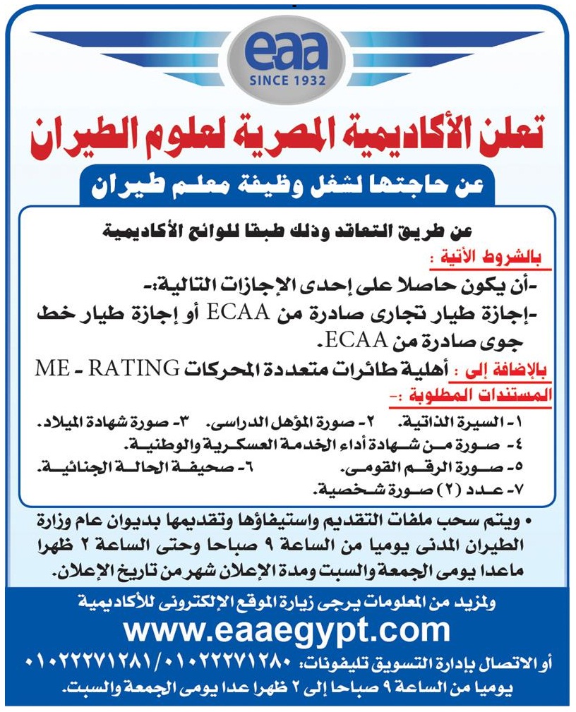 اعلان وظائف الاكاديمية المصرية لعلوم الطيران التابعة لوزارة الطيران المدنى المنشور بجريدة الاهرام يوم 1 / 2 / 2019