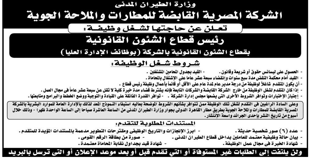 اعلان وظائف وزارة الطيران المدنى الشركة المصرية القابضة للمطارات والملاحة الجوية تعلن عن حاجتها الى شغل
