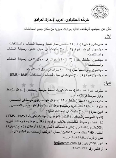 شركة المقاولون العرب لادارة المرافق تعلن عن وظائف خالية بمرتبات مجزية من سكان جميع المحافظات