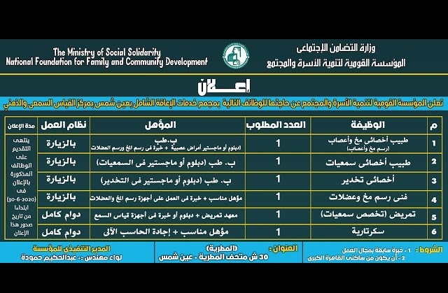 اعلان المؤسسة القومية لتنمية الأسرة والمجتمع بعين شمس بمركز القياس السمعي والذهني عن وظائف شاغرة لديها وهي خاضعة لوزارة التضامن الاجتماعي