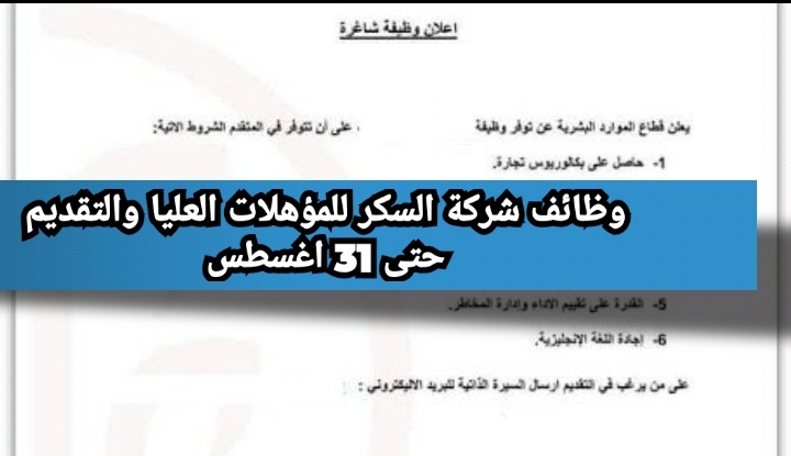 اعلان وظائف شركة السكر للمؤهلات العليا