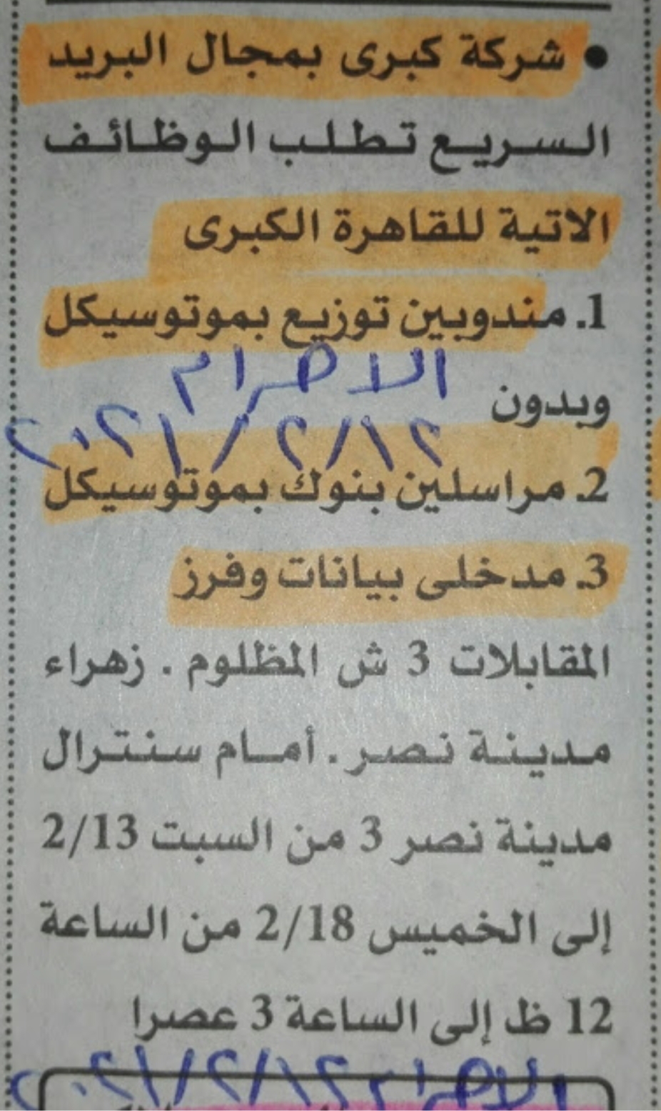 تعلن شركة كبرى بمجال البريد السريع حاجتها لشغل وظائف وفقا للاعلان التالى