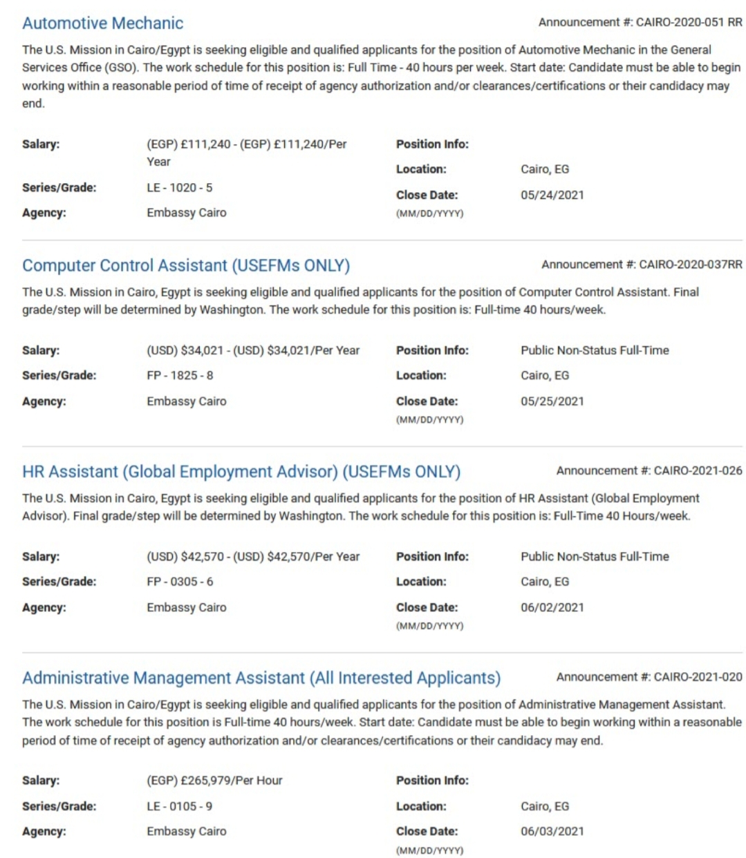 اعلنت السفارة الامريكية بالقاهرة عن حاجتها لشغل وظائف شاغرة وفقا للاعلان الرسمى التالى